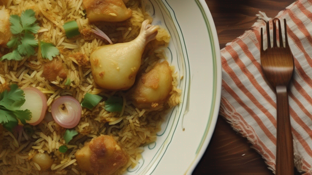 This recipe has closer links to the Hyderabadi chicken biryani recipe and the Kolkata biryani, which is famous for including potatoes.
